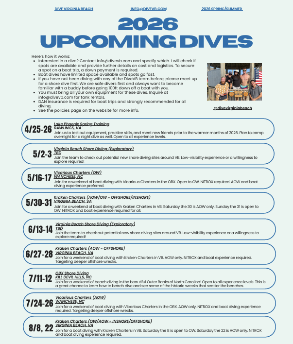 And lastly, boat diving? Last year, we were lucky to hit some great dives out of the Outer Banks and Virginia Beach, including stellar days on the U-85, Proteus, Consols, and the Light Tower. We’re hoping to do the same this year and dive to wrecks from Hatteras to the Eastern Shore, with offshore wrecks for the experienced divers planned along with inshore days for the newer divers.