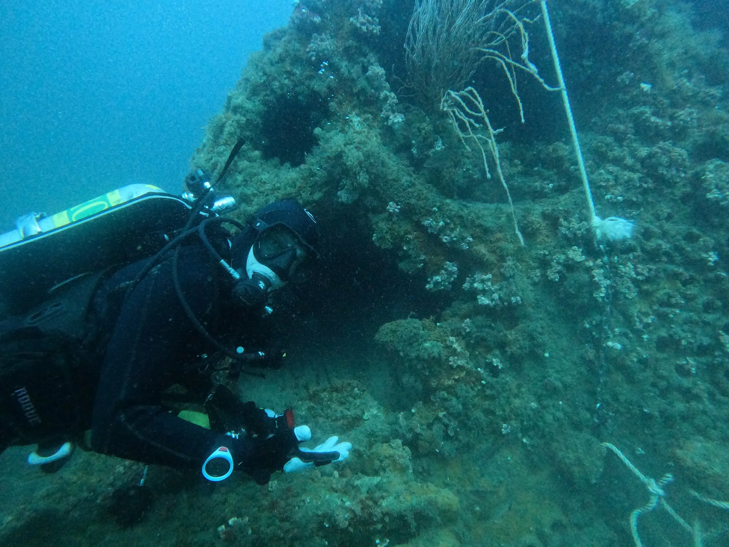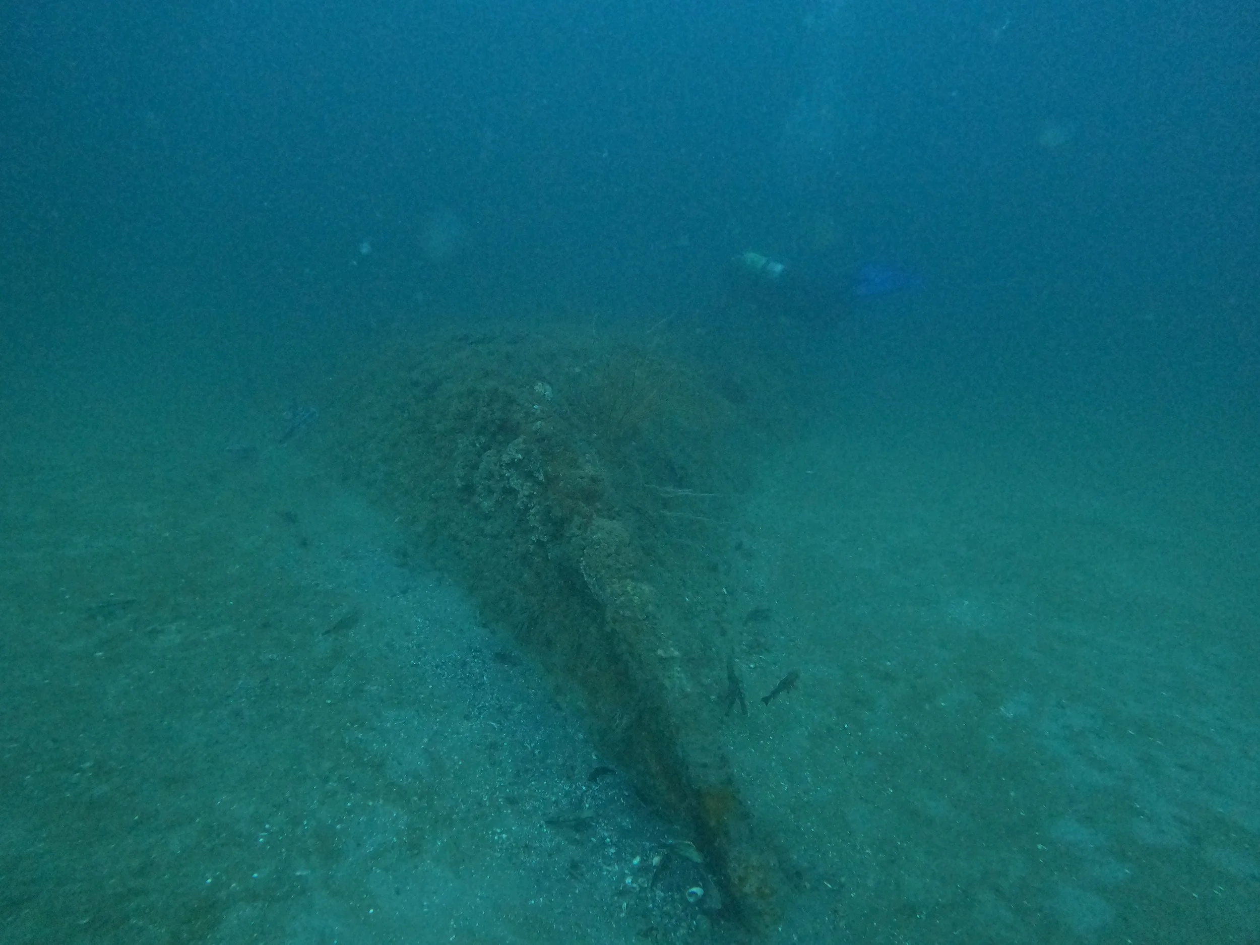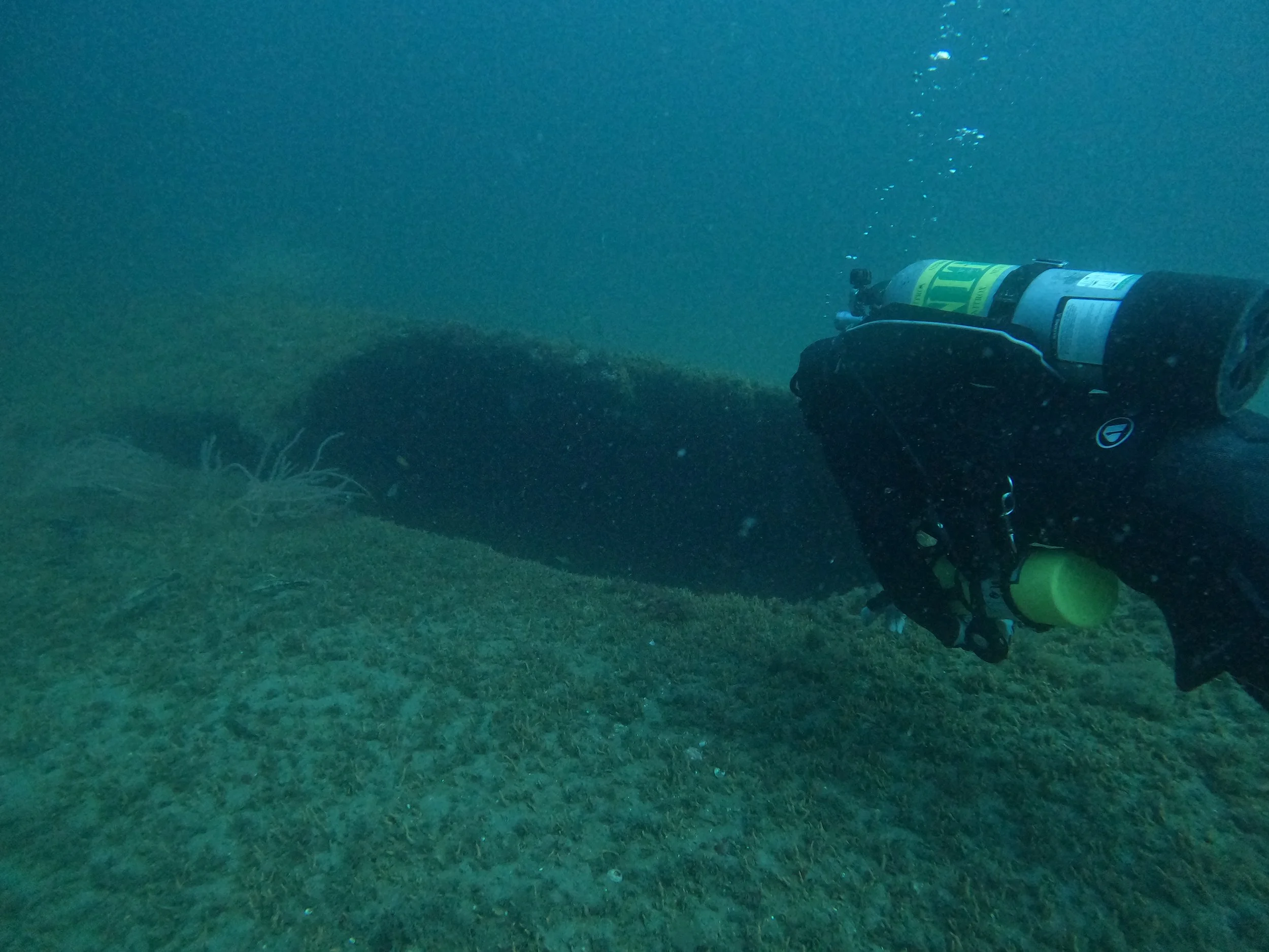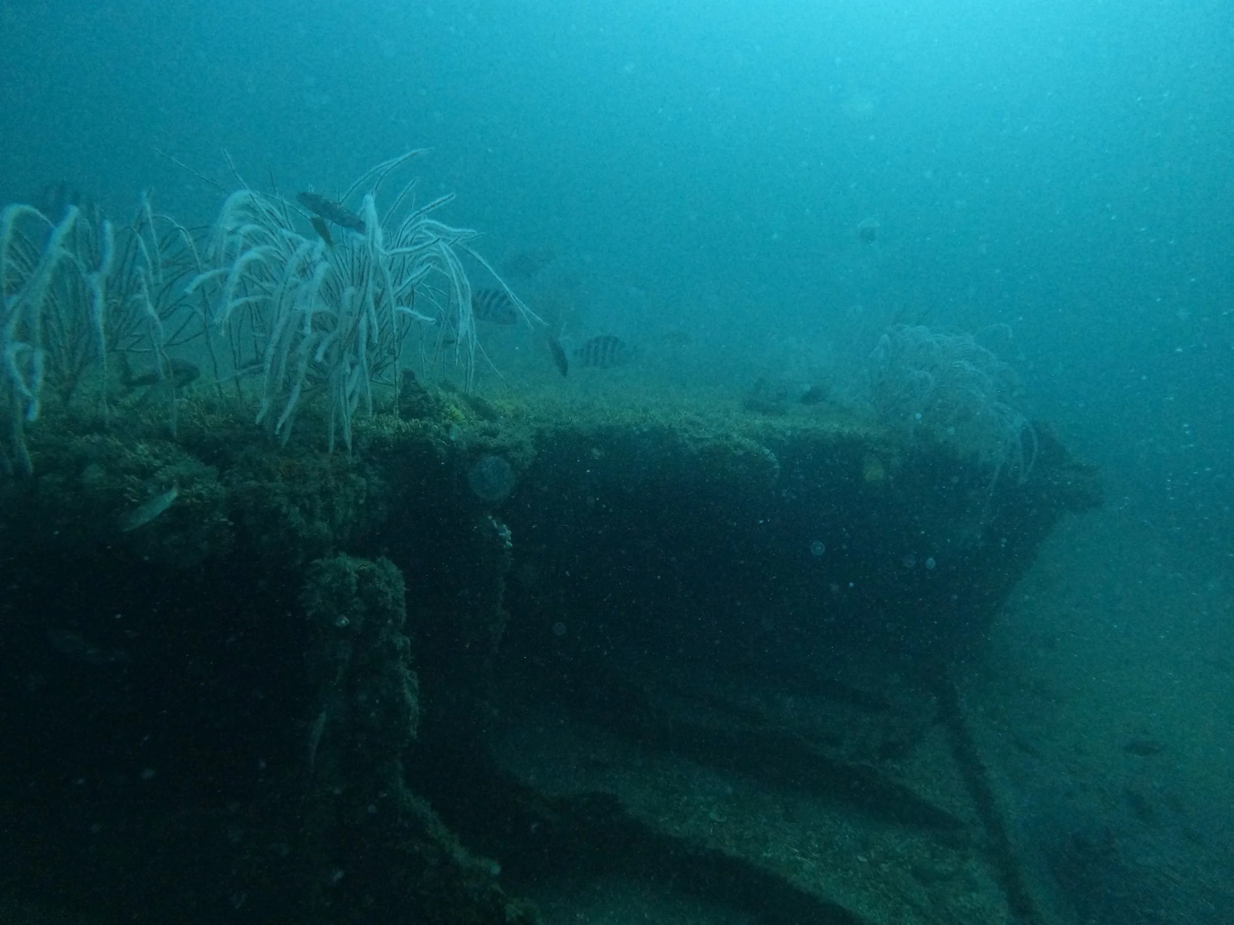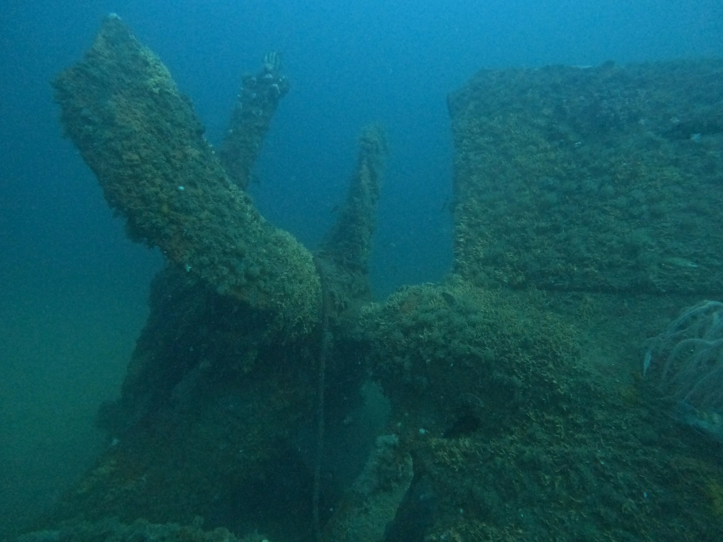 The wreck lies upside down with much of its structure collapsed and buried in the sand. The stern and propeller are intact and rise 20-some feet off the bottom. The propeller shaft runs through the stern where the hull has cleared and made a swim through. The engine and boilers are exposed amidships. The forward section is mostly broken down, but the bow is discernible.